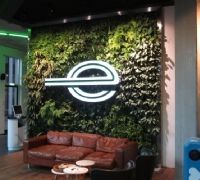 Realisatie van een verticale binnentuin van ca. 15 m2 met ruim 340 planten. Voorzien van volledig automatisch irrigatiesysteem en verlicht logo. Dankzij de door MOOOZ ontwikkelde plantenzakken nemen MOOOZ Indoor Green Walls zoals deze bijzonder weinig ruimte in. De totale dikte van de constructie bedraagt nog geen 7 cm. Een automatisch irrigatiesysteem zorgt er voor dat de planten dagelijks water en voedingsstoffen krijgen en een verlicht logo zorgt er voor dat de wand extra opvalt.