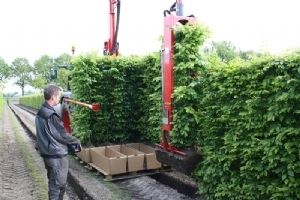Quickhedge heeft een nieuwe machine laten ontwikkelen om nog efficiënter kant-en-klaar hagen te rooien. De radiografisch bestuurbare kraan grijpt kluiten van 1 meter lengte uit de grond en plaatst deze direct in dozen. De kluiten van de QuickHedge-hagen staan los in de grond omdat de rijen hagen jaarlijks ondersneden worden met een U-vormig mes met behulp van GPS. Vervolgens wordt ieder haagelement in de rij apart machinaal los gestoken. De oude machine pakte de kluit bovengronds vast met een klem op deze uit de grond te tillen. Ondanks dat deze klem omwikkeld was met jute, beschadigde er wel eens een tak of bij sommige haagsoorten tijdens de sapstroom de bast. “Onze hagen zijn dankzij het ondersnijden jaarrond leverbaar, dan moeten we hier machinaal ook volledig op ingericht zijn” aldus QuickHedge-directeur Peter Bongers. De nieuwe machine werkt efficiënter en zonder beschadigingen. De kraan is door middel van rechtlijnige bewegingen makkelijker te bedienen. De grijper van de kraan bestaat uit twee hydraulische rieken. Deze worden in beide zijde van de ondersneden kluit gestoken. De kluit wordt uit de grond getrokken en vervolgens in de doos geplaatst. Bijkomend voordeel van de rieken is dat ze de kluit als het ware perforeren, waardoor er extra zuurstof en water bij de wortels komt. Bongers: “Sneller en makkelijker rooien, en dat alles door één mankracht.” Filmpje van de rooier in actie is zien op: http://youtu.be/IgeEKyHmH-Q