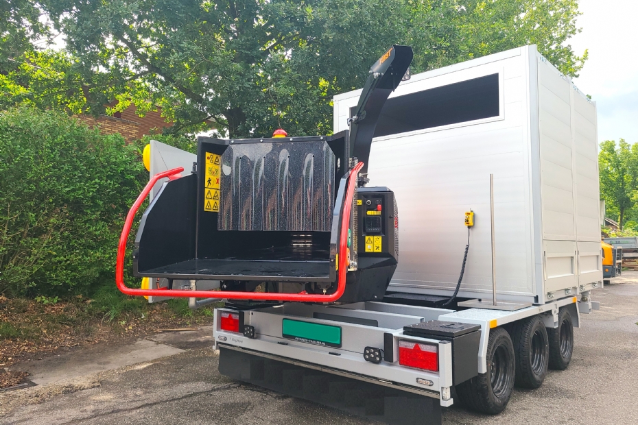 Het project vergde flink wat uitzoekwerk. 'Uiteindelijk hebben we aanhangwagenbouwer Kuiphuis bereid gevonden aan de ontwikkeling mee te werken. Die is mee gaan denken, gaan tekenen en heeft ook goed gekeken naar wat RDW-toelaatbaar is. Met de versnipperaar achterop kun je de bak zijwaarts kiepen.' LMB Van Ginkel voegde daar wensen aan toe qua volume, afwerking en details. 'Dat is aardig gelukt.'